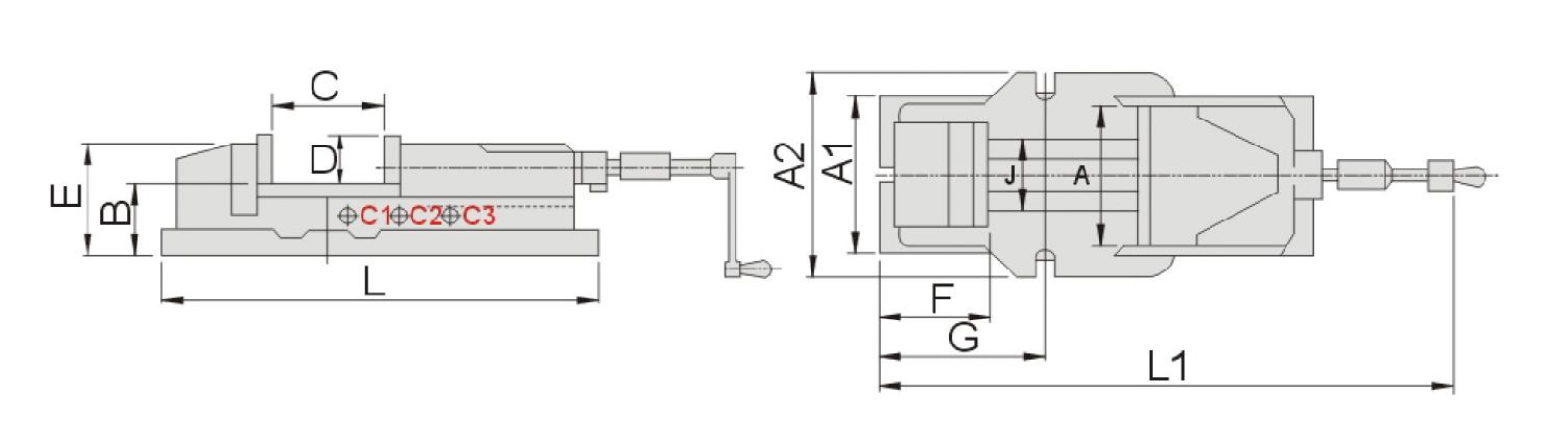 | 訂購(gòu)編號(hào) | 型號(hào) | A | A1 | A2 | B | 夾持範(fàn)圍 | D | E | F | G | J | L | L1 | 夾持力 | 主體重量 N.W. | 底盤(pán)重量 N.W. | |||