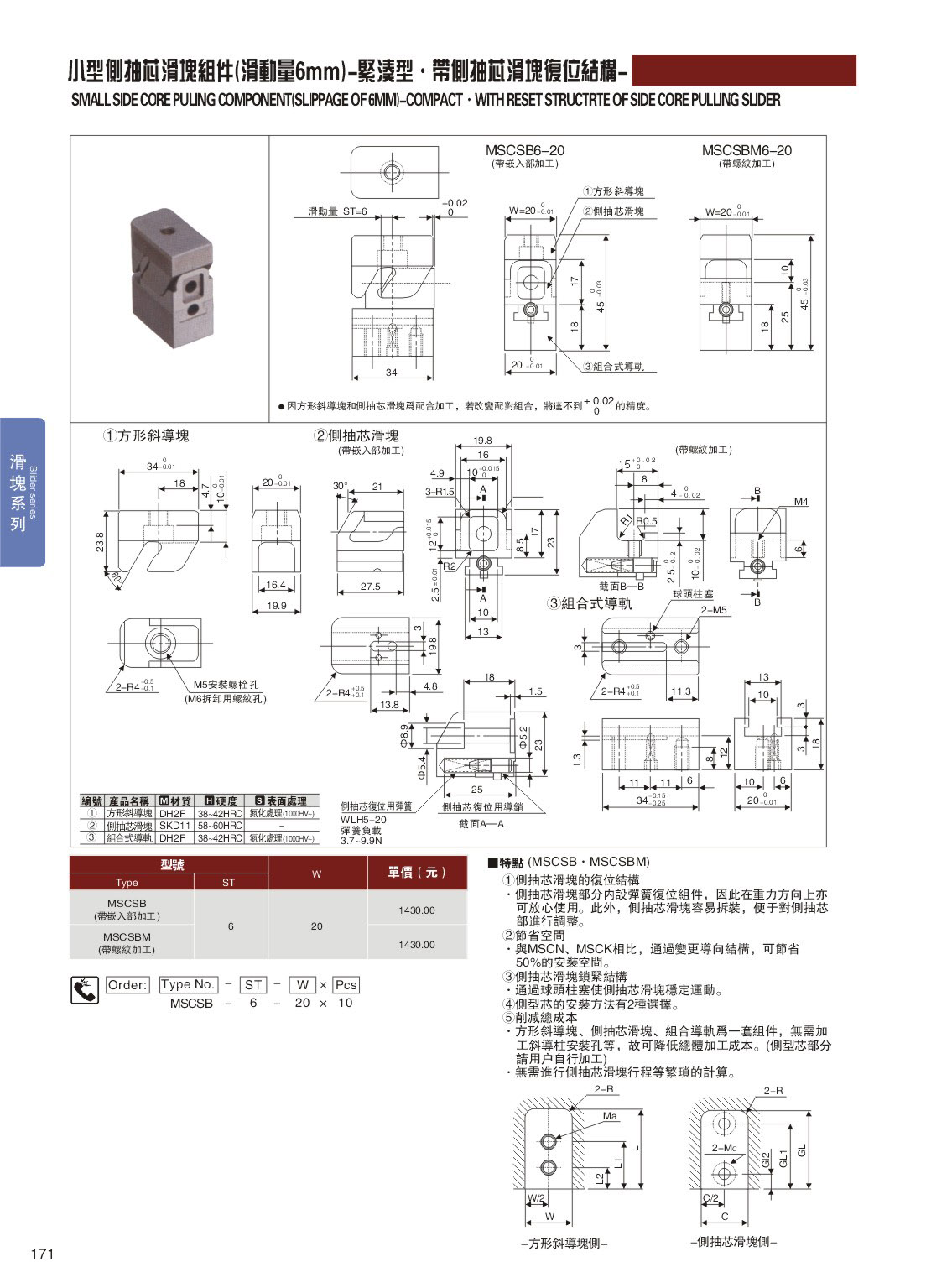 訂購:171-小型側抽芯滑塊組件(滑動量6mm)-緊湊型˙帶側抽芯滑塊復位結構 MSCSB