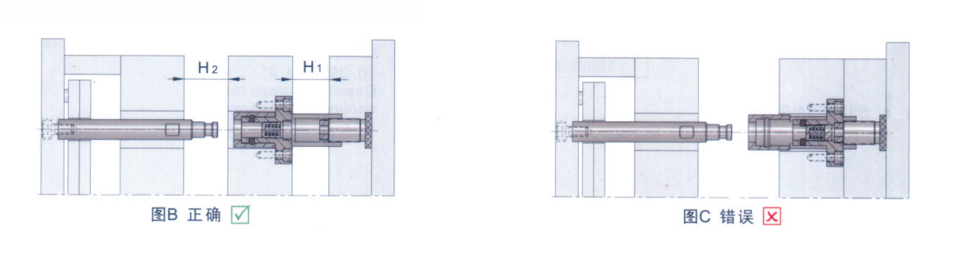 如下圖所示:當(dāng)插桿完全拔離活塞(第二次開模開始打開或完全打開)狀態(tài)下, 必須保證第一次開模行程處于完全打開狀態(tài),否則將會(huì)導(dǎo)致合模過程中,因插桿無法插入而損壞內(nèi)鎖模扣。