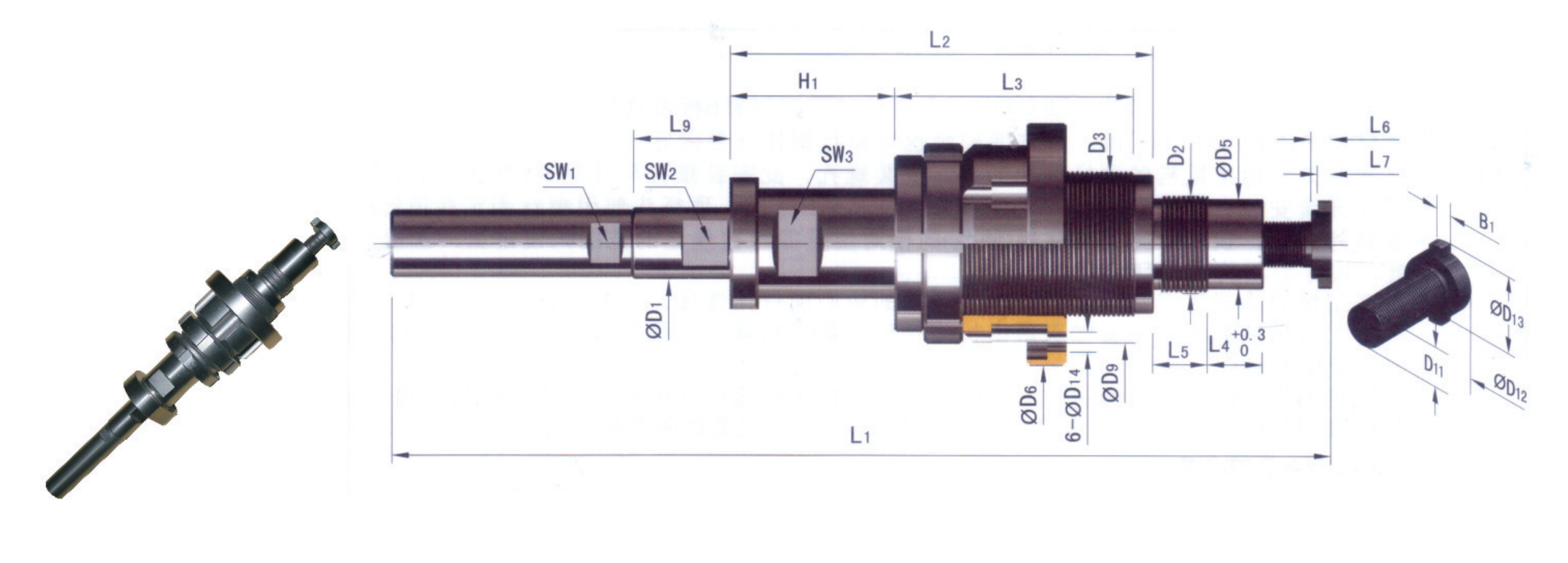 旋轉(zhuǎn)外牙套,調(diào)節(jié)外牙套與法蘭的相對(duì)位置即可在規(guī)定的范圍內(nèi)設(shè)定第一次頂出行程 “S1”的位置,設(shè)定后再將法蘭鎖緊;