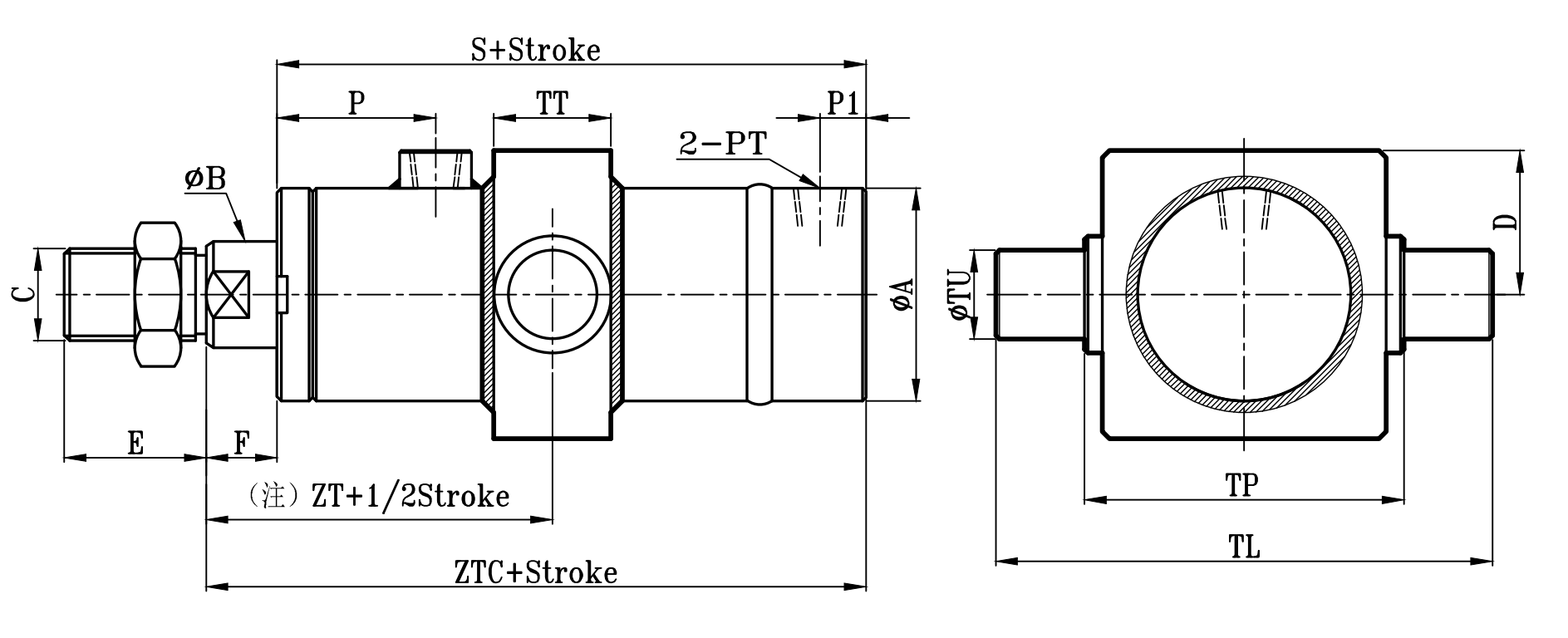 | 缸徑 BORE | ΦA(chǔ) | ΦB | C | E | F | F1 | P | P1 | PT | S | T | ZT | ZTA | ZTC | ΦTU | TL | TP | TT | D |