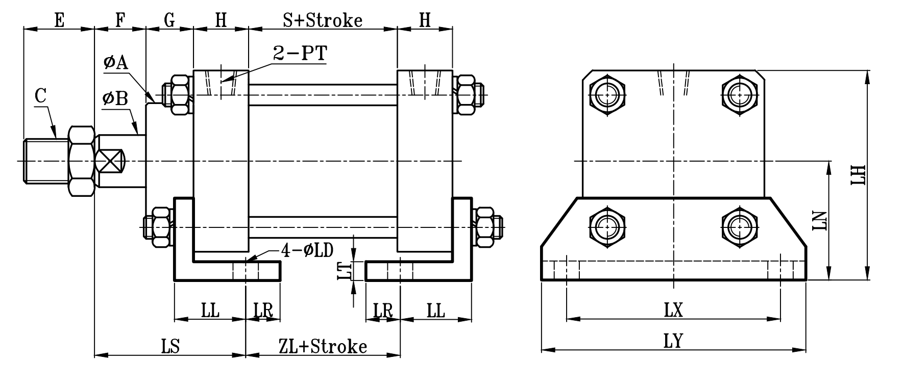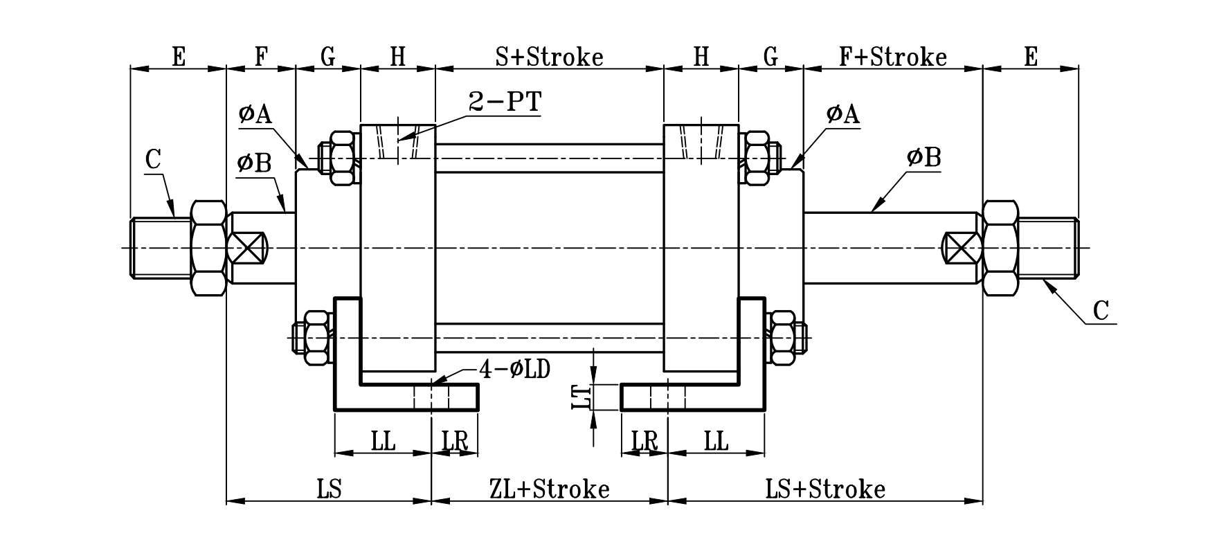 | 缸徑 BORE | ΦA(chǔ) | ΦB | C | E | F | G | H | PT | S | LS | ZL | ΦLD | LH | LN | LL | LR | LT | LX | LY |