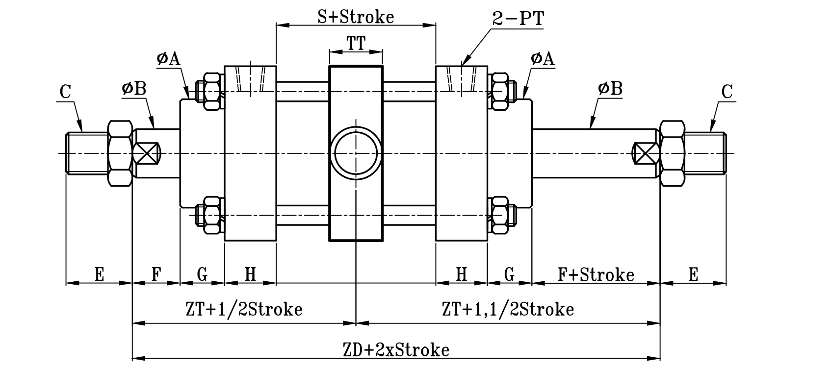 | 缸徑 BORE | ΦA | ΦB | C | E | F | G | H | PT | S | ZD | ZT | TL | TP | TT | ΦTU |