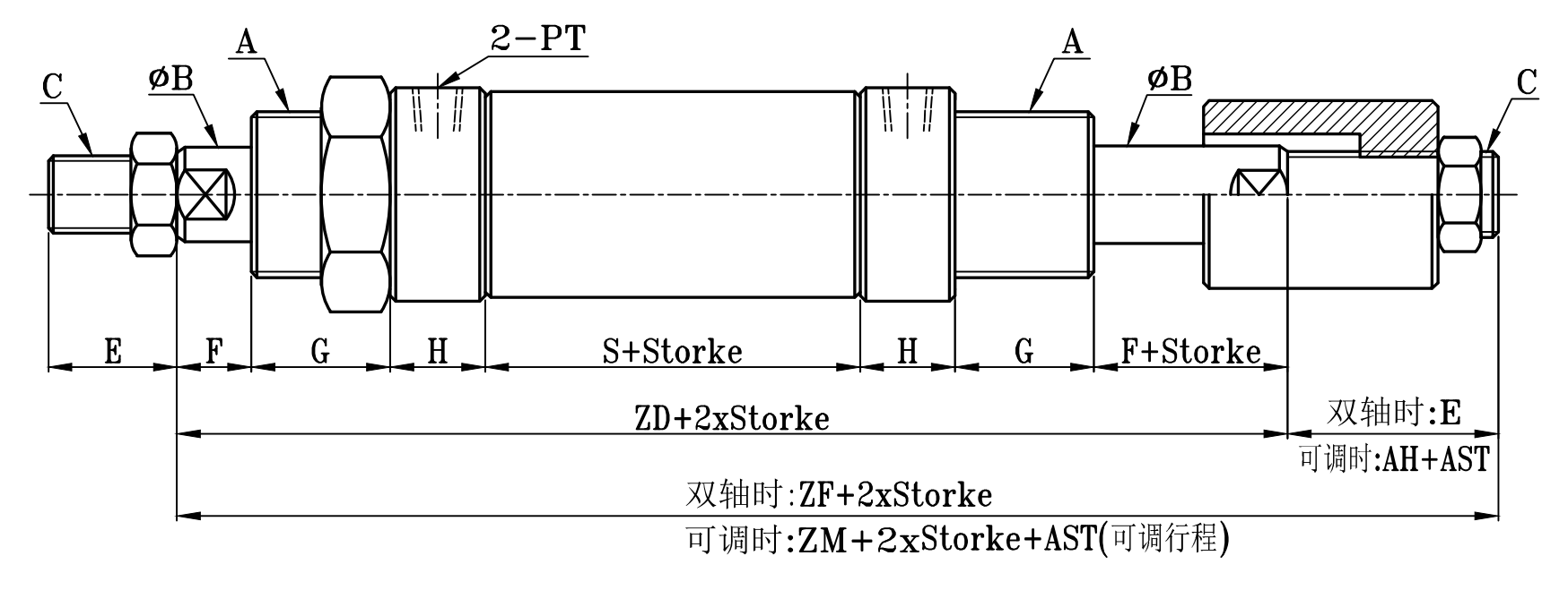 | 缸徑 BORE | A | ΦB | F | G | H | ΦI | P | P1 | PT | S | Z | ZD | ZF | ZM | AH | C | E | J | JH | W | ΦV |