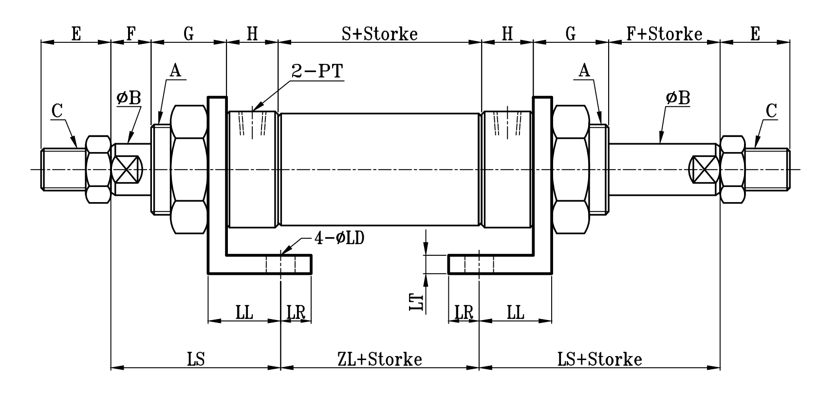 | 缸徑 BORE | A | ΦB | C | E | F | G | H | ΦI | PT | S | LS | ZL | ΦLD | LH | LN | LL | LR | LT | LX | LY |
