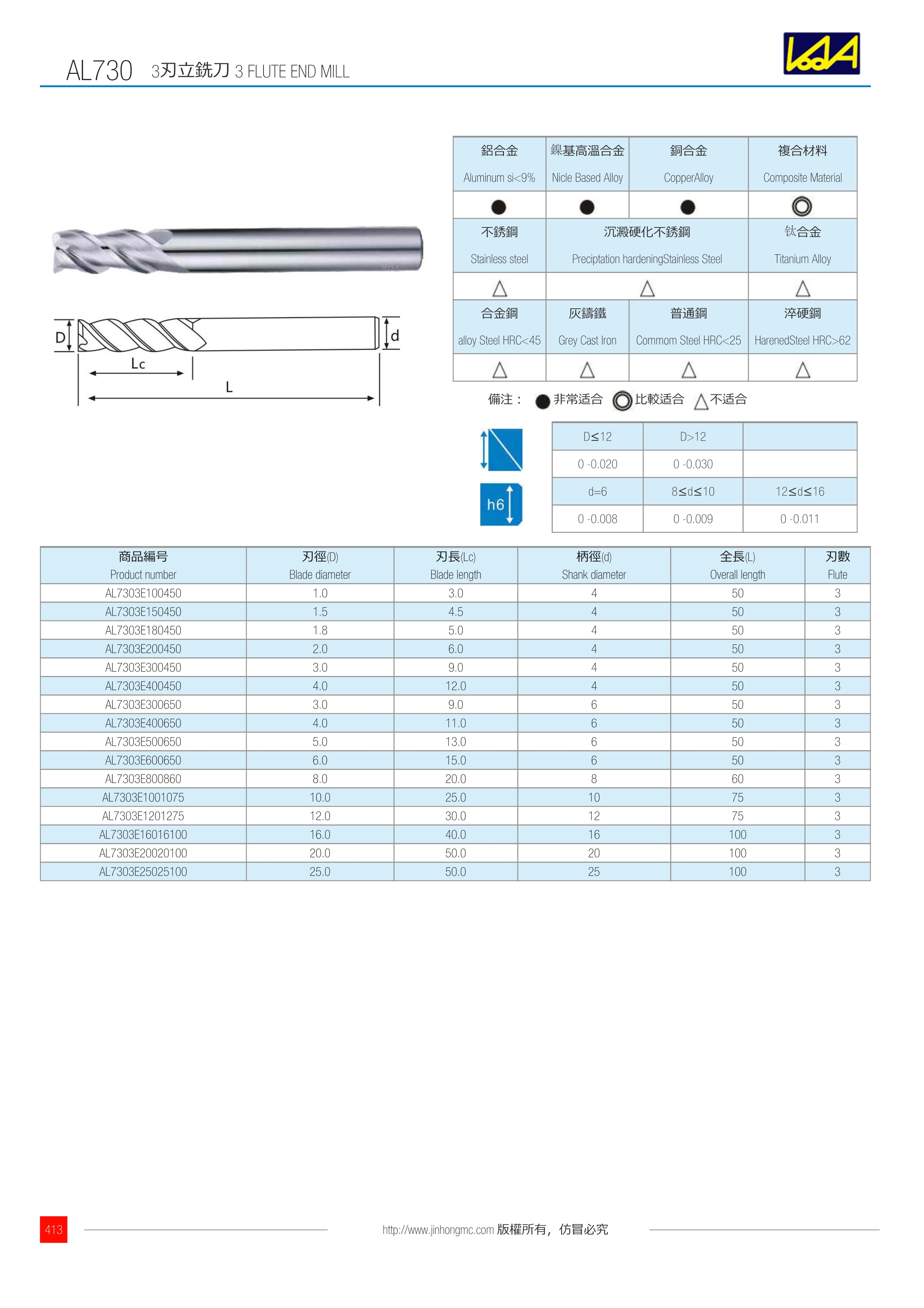 | 商品編號 Product number | 刃徑(D) Blade diameter | 刃長(Lc) Blade length | 柄徑(d) Shank diameter | 全長(L) Overall length | 刃數 Flute |