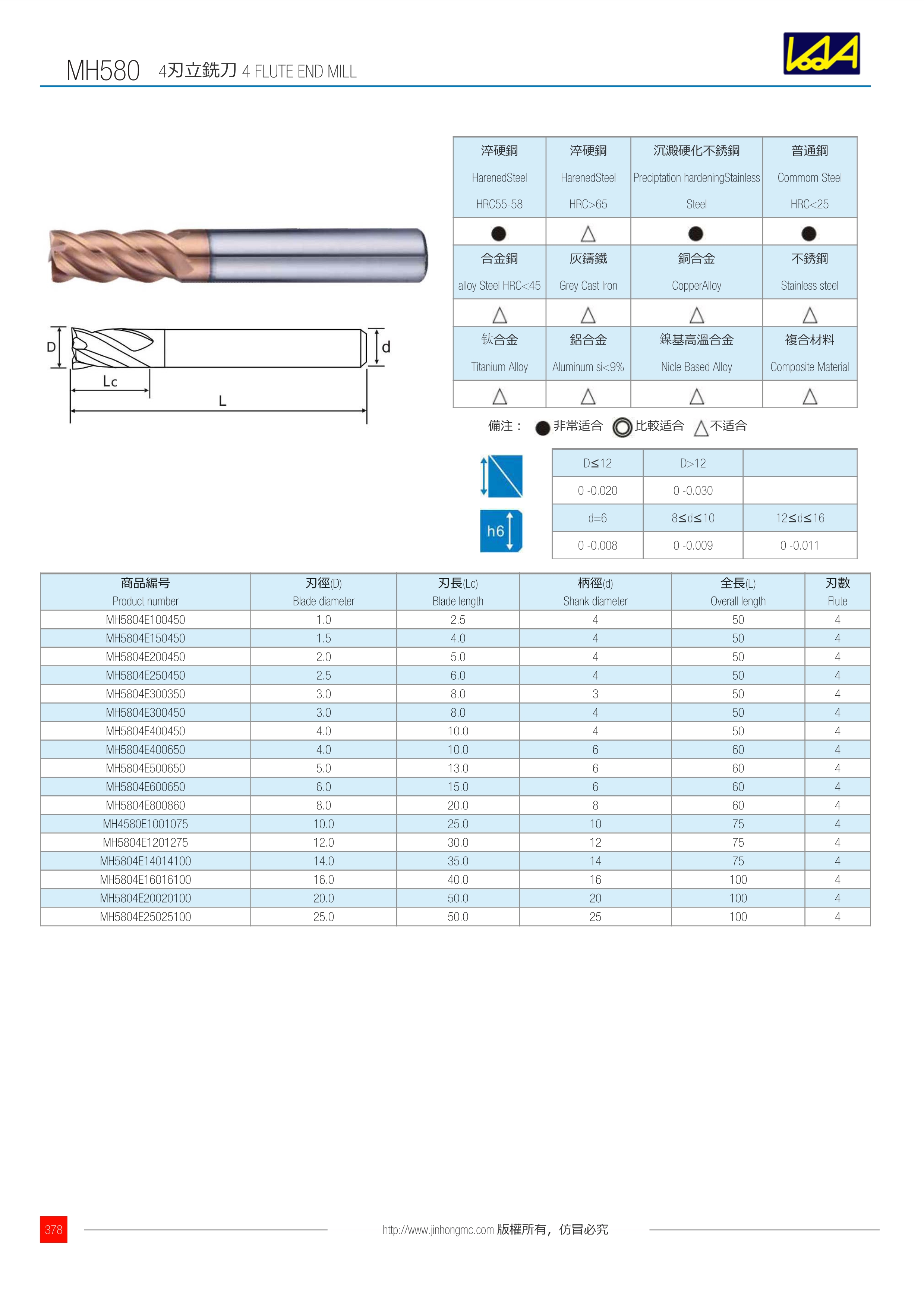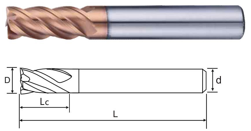 | 商品編號 Product number | 刃徑(D) Blade diameter | 刃長(Lc) Blade length | 柄徑(d) Shank diameter | 全長(L) Overall length | 刃數 Flute |